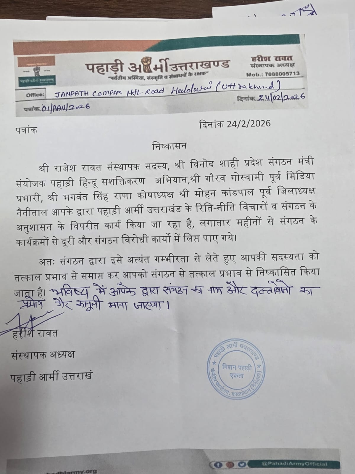 View Allपहाड़ी आर्मी ने संगठन विरोधी कार्य करने वाले पदाधिकारीयों को संगठन से किया निष्काशित